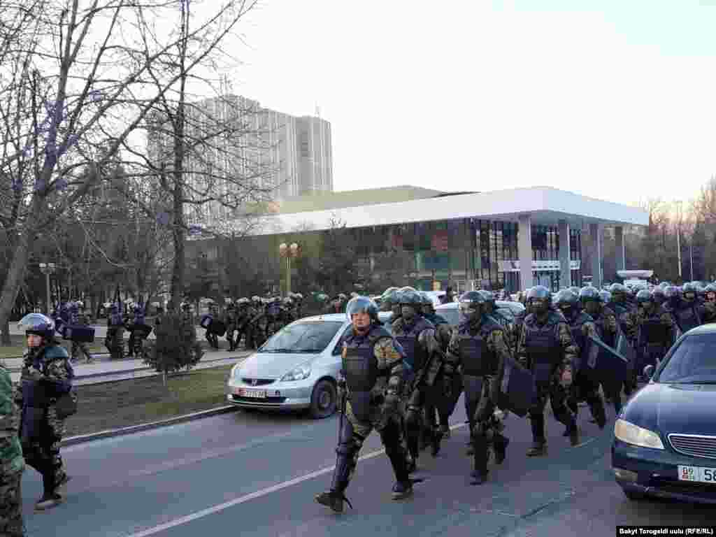 Атайын даярдыктагы күчтөр, милиция кызматкерлери суу бүркүп, көздөн жаш агызуучу газ колдонуп, кулак тундуруучу гранаталарды ыргытуу менен Ала-Тоо аятындагы жана Ак үйдүн алдындагы чогулган элди кууп таркатып жатат.