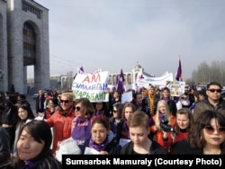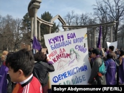 Бишкектеги акцияга чыккан активисттер. 8-март, 2019-жыл.
